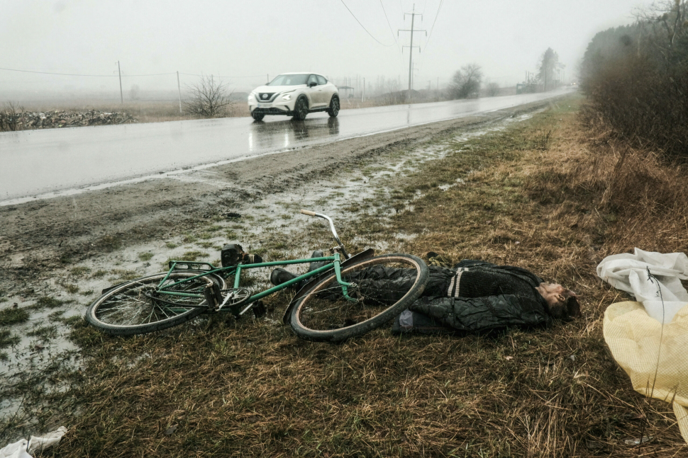 Idős férfi holtteste Bucsa egy útja mellett. Az oroszok ezen a településen hajtották végre az orosz-ukrán háború első évének legsúlyosabb háborús bűncselekménysorozatát. Az orosz offenzíva idején (ukrán források szerint) legalább 400 civilt öltek meg. Nemzetközi tudósítók szerint a legtöbb embert mindennapi tevékenysége közben érte a halál, civil jogvédő szervezetek pedig azt mondják: a jelek arra utalnak, hogy az oroszok válogatott módszerekkel, szisztematikusan végezték ki a helybéli ukránokat.