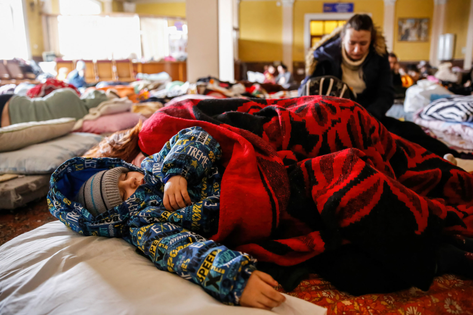 Ukrajnai menekült gyerekek és felnőttek. A menekültek egy ideiglenes szálláson alszanak, amelyet Lviv főpályaudvarán hoztak létre, miközben folyt az ukrajnai orosz invázió, 2022 áprilisában. Az ENSZ menekültügyi főbiztosa szerint Ukrajnából egy év alatt több mint 17 millió ember menekült el, ebből 9,1 millióan már visszatértek hazájukba.